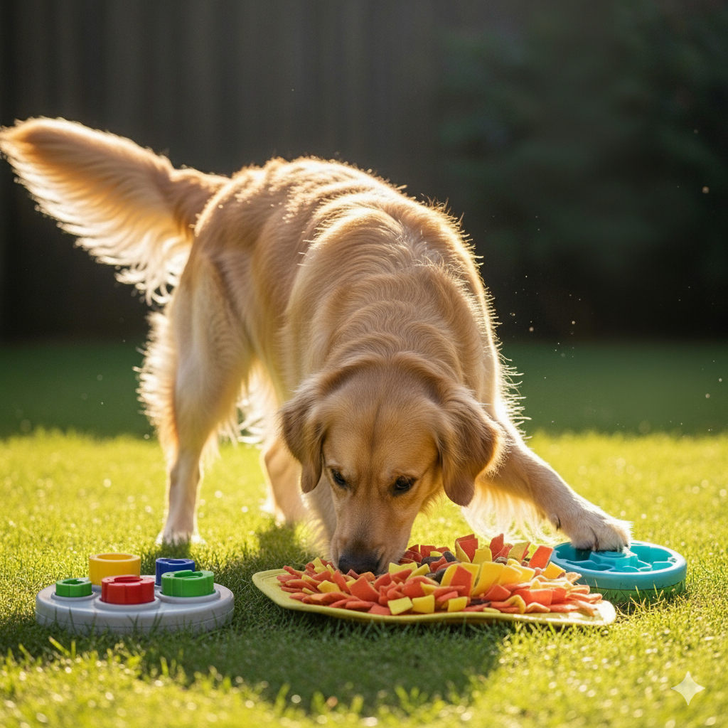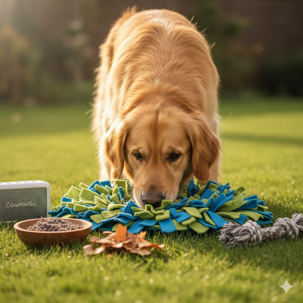 Tapetes de Cheiro (Snuffle Mats): Eles imitam uma grama onde o cão precisa procurar a comida, ativando o instinto de forrageamento.