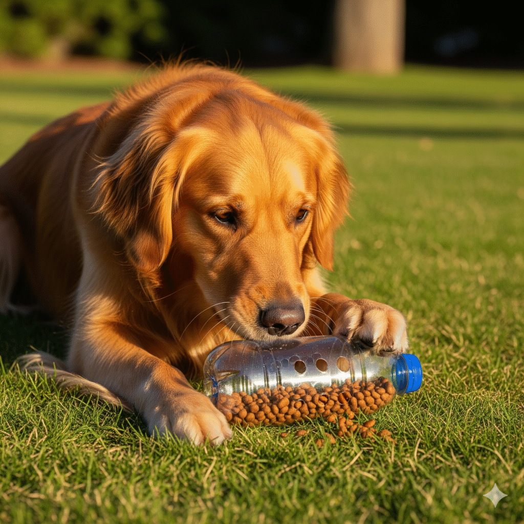Garrafa Pet: Faça pequenos furos em uma garrafa plástica limpa, coloque ração dentro e feche. O cão terá que rolar a garrafa para a comida sair.