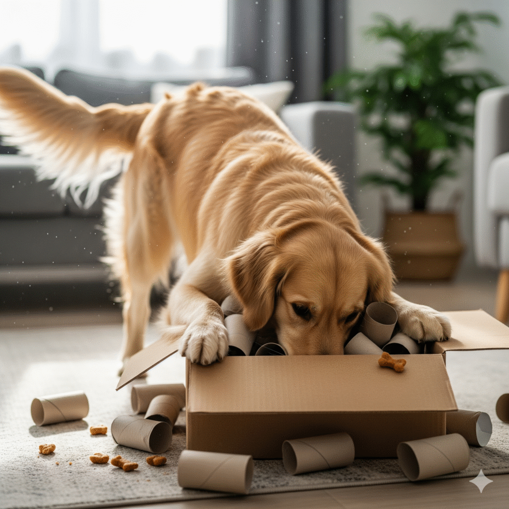 Enriquecimento ambiental é a prática de modificar o ambiente de um animal para torná-lo mais desafiador e estimulante. O objetivo é permitir que ele expresse seus comportamentos naturais, como caçar, farejar, roer e interagir. Em essência, é dar ao seu cão uma “vida de cão” mais completa e interessante.