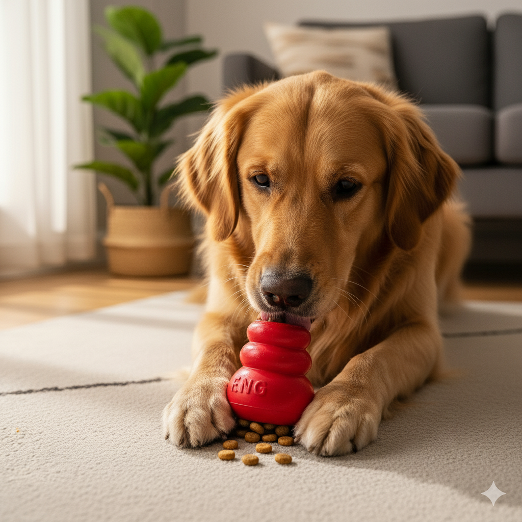 Brinquedos Interativos: Brinquedos que liberam petiscos, como o kong, são excelentes para manter o cão ocupado por um bom tempo.